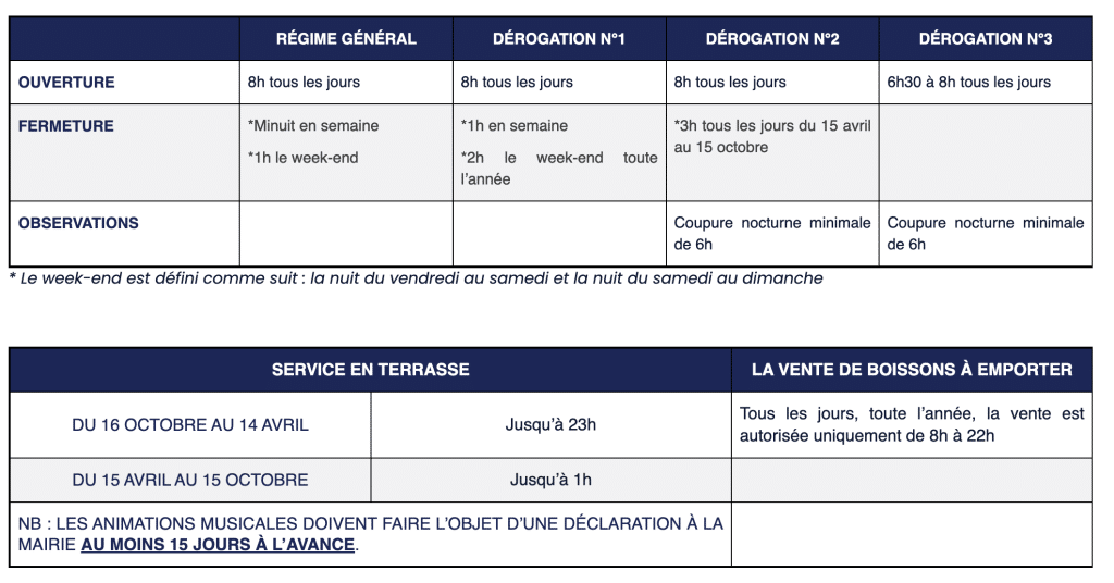 Pour ceux souhaitant sortir du régime général en vigueur (voir tableau) vous avez la possibilité de demander une dérogation sous conditions. Les dérogations sont accordées pour une durée d’un an par arrêté municipal après consultation de la commission consultative des débits de boissons composée d’élus, de gérants de débits de boissons, de riverains et du commissaire de Police de la Baule. La période dérogatoire s’étend du 1er avril au 30 mars de l’année suivante.